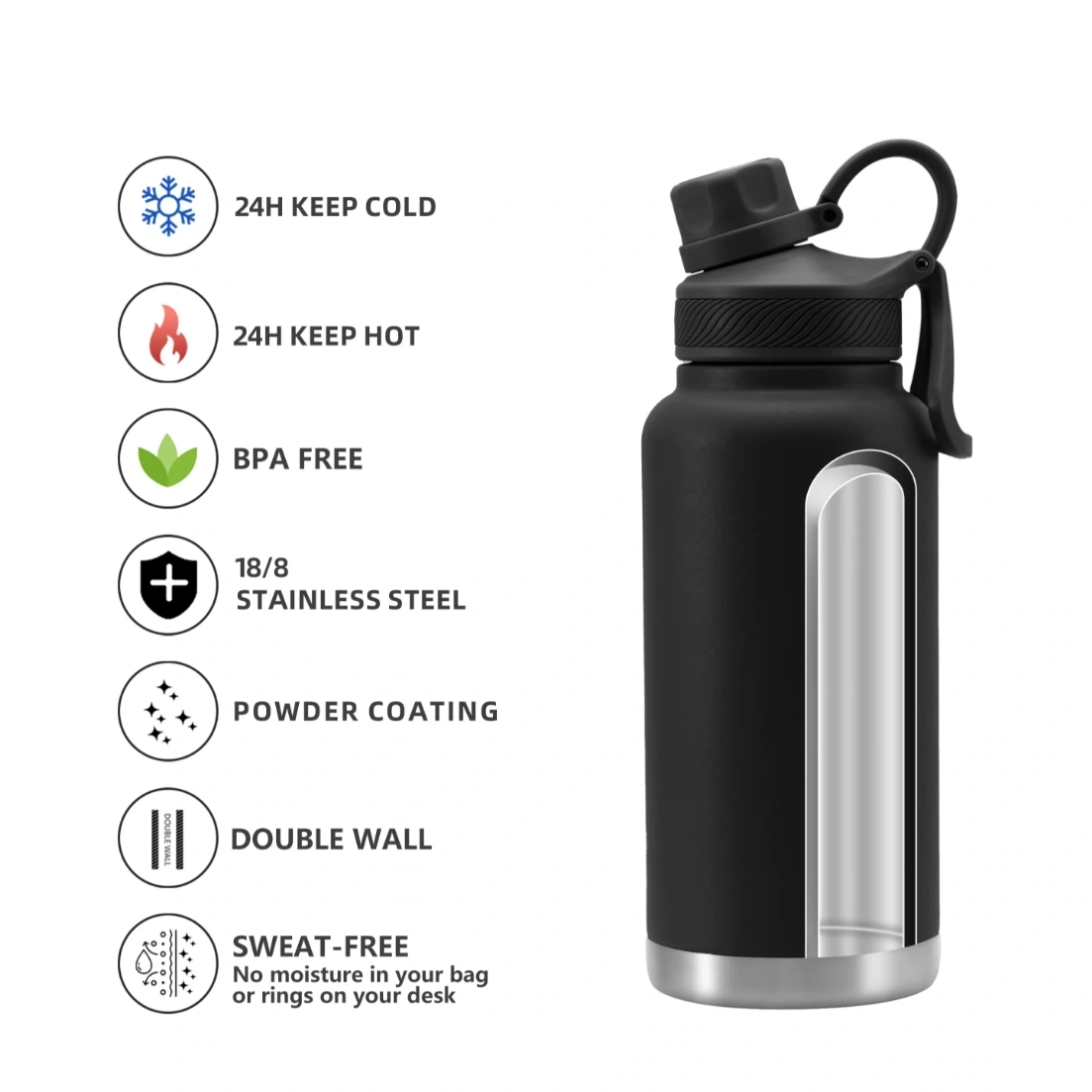 DOUBLE-WALL VACUUM INSULATION - The double wall vacuum insulation of the water bottle maintains the temperature of inside contents for hours and prevents condensation from forming on the bottles exterior.